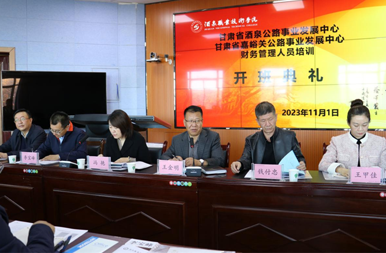 为进一步贯彻落实市委市政府提出的高校服务助推地方行业产业发展的决策部署,2023年11月1日,甘肃酒泉﹠嘉峪关公路事业发展中心财务管理人员培训班在酒泉职业技术学院隆重开班,甘肃酒泉公路事业发展中心副主任钱付忠、工会主席冯艳、财务资产科科长李宝峰,甘肃嘉峪关公路事业发展中心财务资产科科长王甲佳、酒泉职业技术学院党委委员、副校长王金明等出席开班典礼。