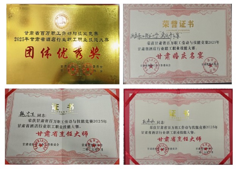 2025年10月17-18日,甘肃省百万职工劳动和技能竞赛2025年甘肃省酒店管理与客房绿色服务行业职工职业技能竞赛在兰州华联宾馆举行。我院烹饪工艺与营养系组建的6人参赛团队(魏忠杰老师带队,5名学生参与),在全省多支参赛队伍的激烈角逐中,凭借扎实的专业功底与创新能力,获得团体优秀奖,团队打造的“鸾凤齐飞宴”获评“陇原婚庆名宴”称号,4人获评“甘肃省烹饪大师”称号,充分展现了我院“赛教一体、产教融合”的育人成效。