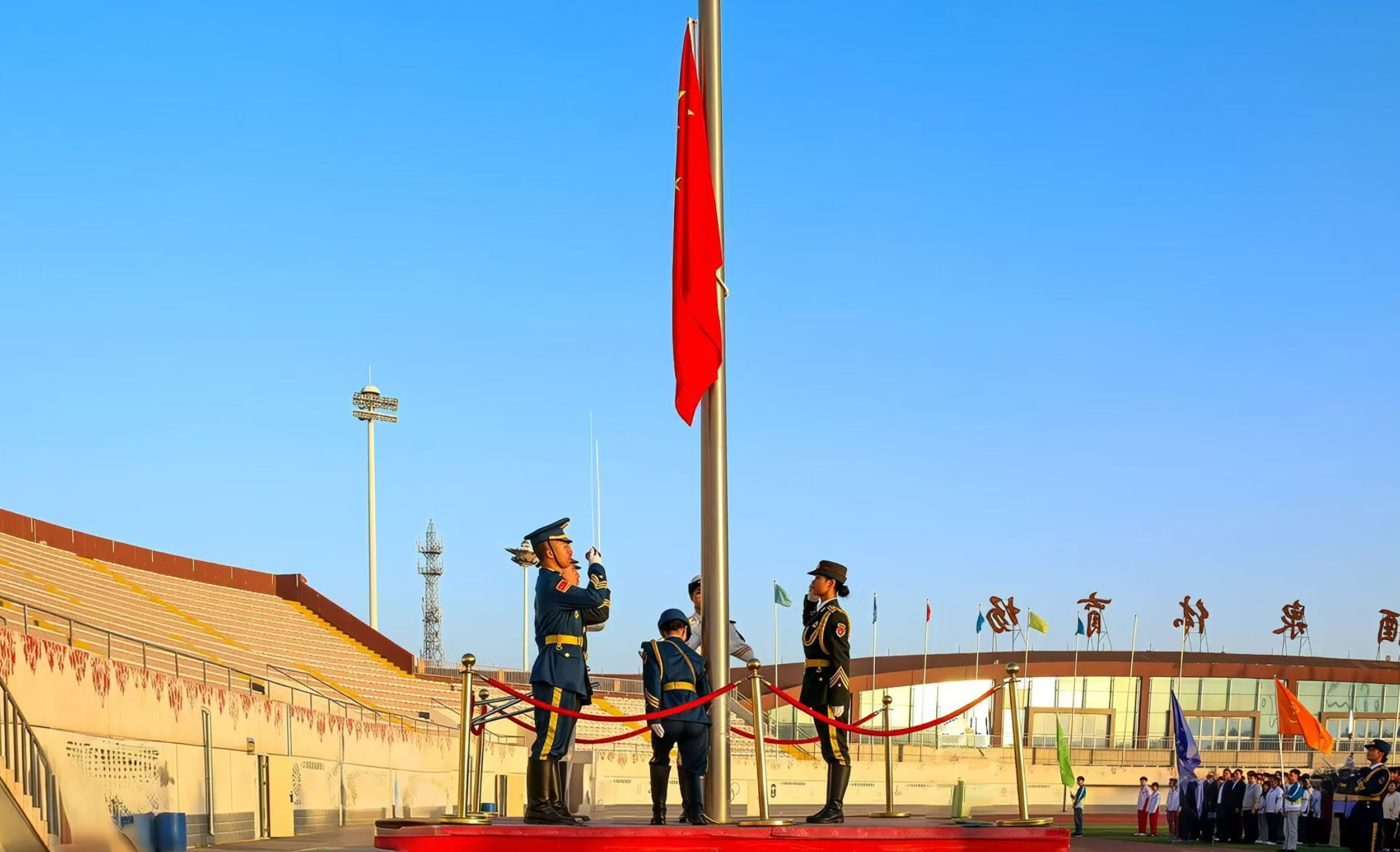 夏末秋初之际,酒泉职业技术大学开启新学期开学第一周。2025年9月1日清晨,学校体育场内举行了庄严隆重的升国旗仪式。学校党委书记易志军出席仪式,学工部、团委负责人,各学院领导班子成员、团委书记、辅导员,以及全体在校生共计8000余人共同参与,在肃穆的氛围中迎接新学期的到来。